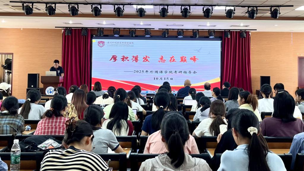 为扎实推进学风建设,服务学生高质量就业与发展,10月15日下午,外国语学院在学院报告厅举办“厚积薄发,志在巅峰”2026届考研指导会。学院领导、系部主任、辅导员及全体考研同学参加了本次会议。