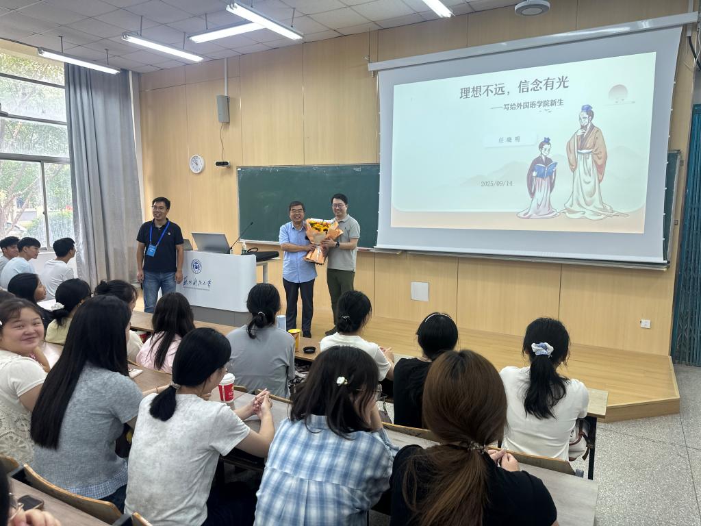 9月14日上午10:30,外国语学院在天平校区J1阶梯教室成功举办2025级新生理想信念教育专题讲座。任晓明老师以“理想不远·信念有光”为主题,为新生带来了一场深刻而动人的精神洗礼,通过优秀校友的成长历程,激励新生坚定专业信念,树立远大人生目标。